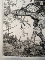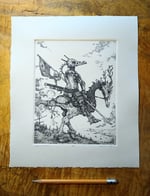 5 9/16" x 7 1/16" zinc plate etching printed in black oil based ink on 9" x 11" Stonehenge grey intaglio paper. Designed and etched in 2018.